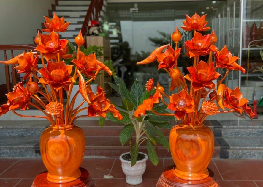 _ 2 Bình hoa sen trang trí phòng thờ phòng khách được làm bằng chất liệu bình cắm gỗ hương đỏ và hoa lá gương bằng gỗ ngọc am tự nhiên 100% _ Kích thước