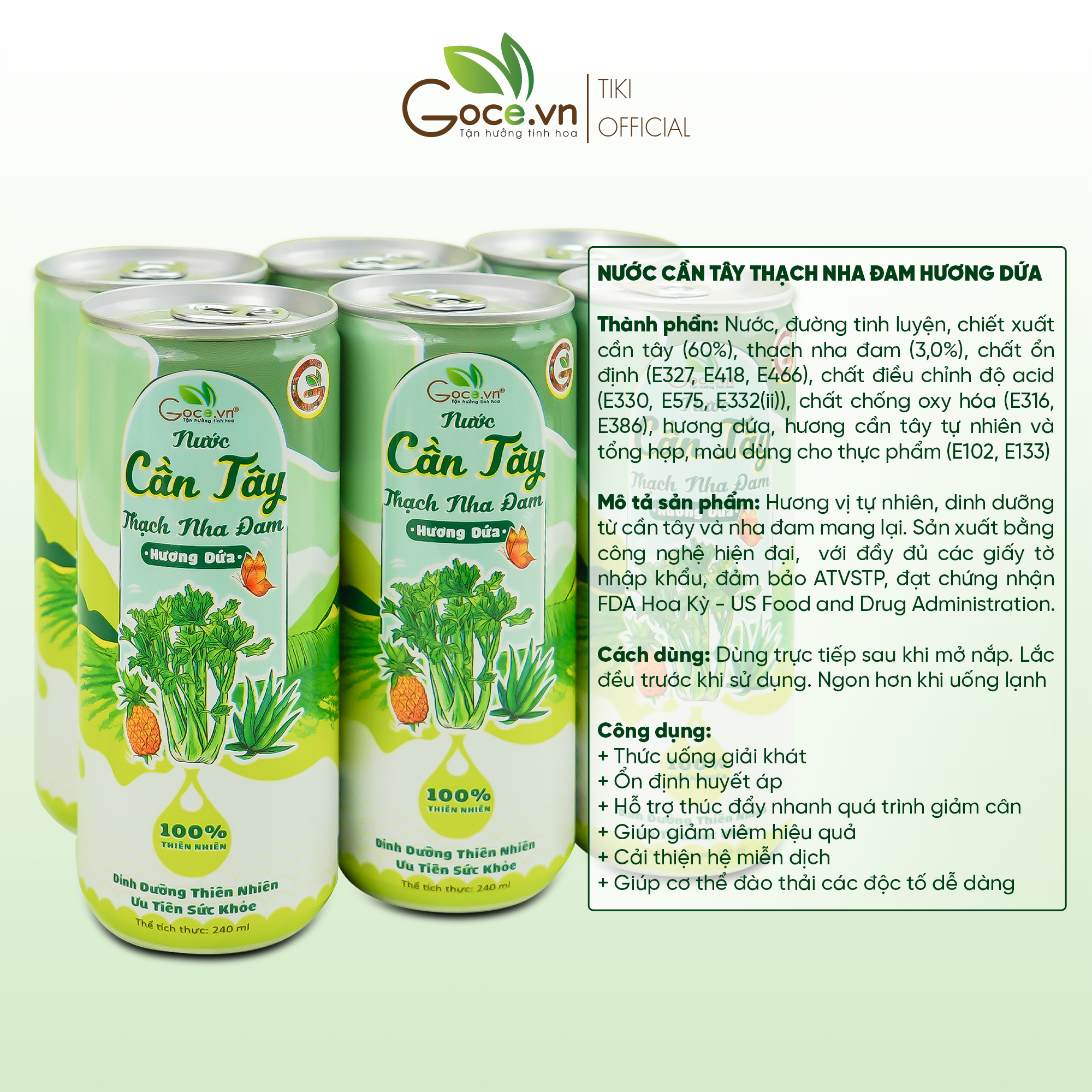- Thành phần: Nước (50%), bột cần tây (19%), thạch nha đam (3%), đường mía, chất ổn định (INS327, INS418, INS466), chất điều chỉnh độ acid (INS330, INS331 (iii)), chất chống oxy hóa (INS316, INS386), hương dứa tổng hợp…