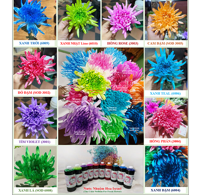 1. THÔNG TIN NƯỚC NHUỘM HOA TƯƠI: - Được sản xuất theo công nghệ Gadot Israel là chế phẩm sinh học giúp hoa cắt cành đổi màu sắc theo ý muốn với tổng 10 màu