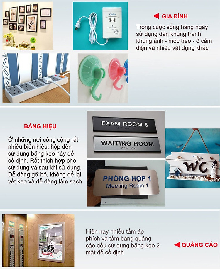 - Bươc 4: Cố định trong 24h để đạt hiệu quả cao nhất Lưu ý : Không chạm tay vào bề mặt băng keo và bề mặt dán vì mồ hôi tay làm bất hoạt keo dính Acrylic gây nên tình trạng dán dễ bong tróc hay dán không dính như mô tả. Độ chịu lực là 0.69g/cm² Không áp dụng trên tường vôi, sơn nước dễ bong tróc, gạch men quá nhẵn bóng và các bề mặt khó dính khác.