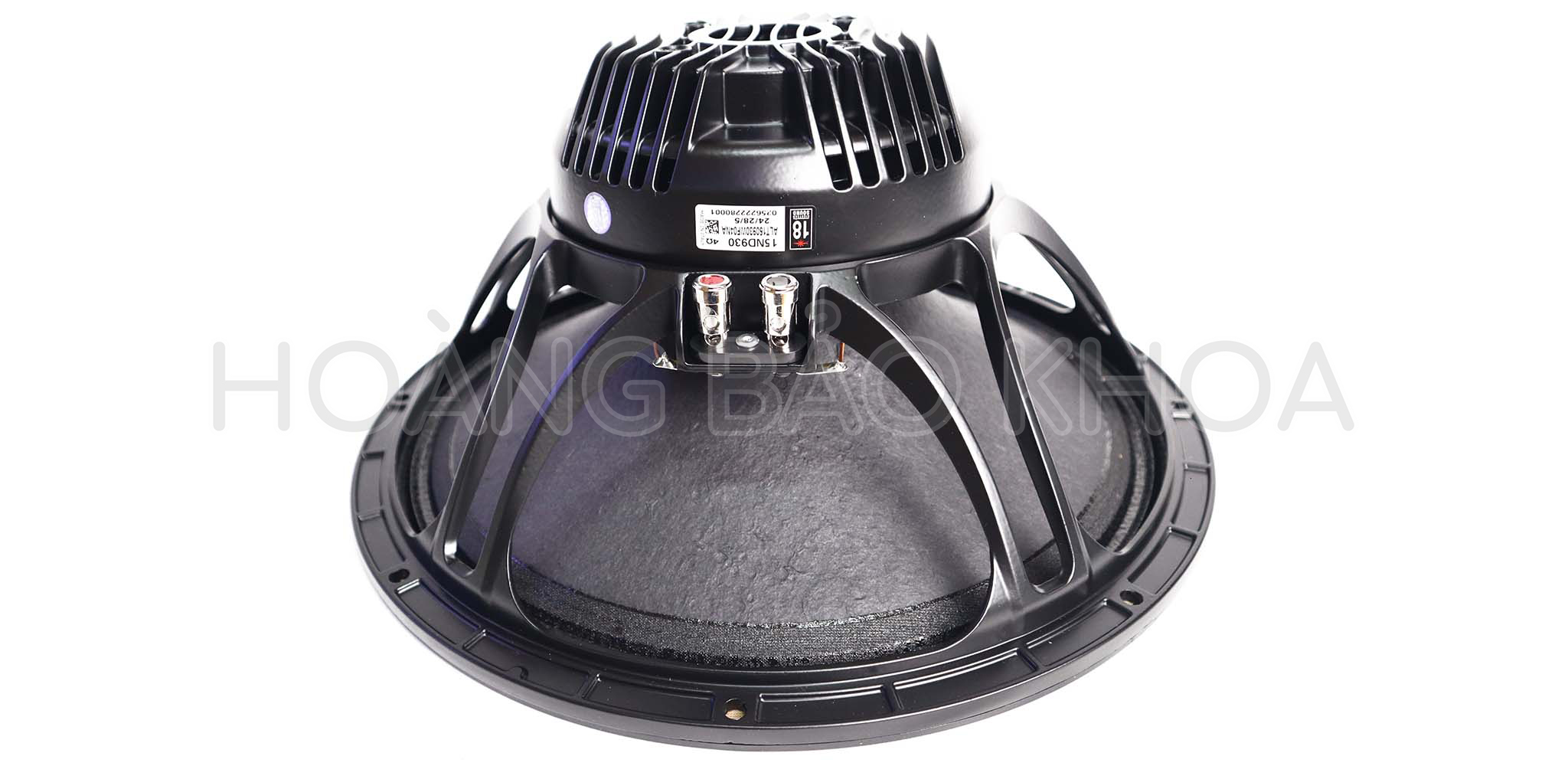 Xuất xứ: Ý  Độ nhạy trung bình 97 dB SPL 1W / 1m.  Cuộn dây âm thanh 75mm (3 in).  Công suất 500W.  Công suất liên tục 800W.  Cụm nam châm từ Neodymium.  Công nghệ Double Demodulating Rings (DDR) để giảm độ méo.  Nón loa chống ẩm.  Thích hợp cho hệ thống 2 chiều và các ứng dụng loa subwoofer nhỏ gọn tải cao.  Cụm nam châm từ Neodymium bên ngoài.  Cone và plates bảo vệ khỏi thời tiết để sử dụng ngoài trời.  Được đề xuất cho hệ thống đa chiều và các ứng dụng giám sát phòng thu 15ND930 là một  từ neodymium tần số thấp mở rộng, công suất cao, đáp ứng các yêu cầu nghiêm ngặt nhất trong các bộ chuyển đổi chuyên nghiệp chất lượng cao. Chất lượng âm thanh và hiệu suất cao đã đạt được nhờ khai thác các công nghệ tiên tiến nhất hiện nay. Nhờ tính linh hoạt của nó, 15ND930 có thể được sử dụng trong các thùng phản xạ nhỏ gọn 2 chiều với củ 1,4" Cụm nam châm neodymium đảm bảo nồng độ từ thông cao, nén công suất thấp và trao đổi nhiệt tuyệt vời, vì cấu hình nam châm bên ngoài hiệu quả hơn đáng kể so với cấu trúc liên kết nam châm dưới cực truyền thống. Điều này dẫn đến mức độ cao của hệ số lực và khả năng xử lý công suất với tỷ lệ công suất trên trọng lượng tối ưu. Sự tiếp xúc trực tiếp giữa tản nhiệt lớn và giỏ, cùng với cấu trúc từ tính, thể hiện sự cải tiến cơ bản trong kết nối nhiệt và tản nhiệt. Do đó, khả năng xử lý điện năng được tăng lên và giảm độ nén công suất. Nón cong có cấu hình sâu, được tạo ra từ bột gỗ đặc biệt có độ bền cao, đã được thiết kế để đạt được độ tuyến tính tốt nhất có thể trong phạm vi tần số của nó. Phần bao quanh nón, được làm từ chất liệu vải lanh. Cụm cuộn dây bằng đồng 75mm (3in) được quấn trên một loại sợi thủy tinh chắc chắn  để cải thiện khả năng truyền lực và xử lý điện năng. Độ méo tiếng vốn đã thấp còn được cải thiện hơn nữa nhờ Vòng giải điều chế kép (DDR) giúp làm phẳng trở kháng và pha bằng cách truyền điện liên tục. Một lớp phủ đặc biệt được áp dụng cho cả mặt trên và mặt sau giúp cho 15ND930 có khả năng chống lại tác động ăn mòn và quá trình oxy hóa cao hơn rất nhiều.