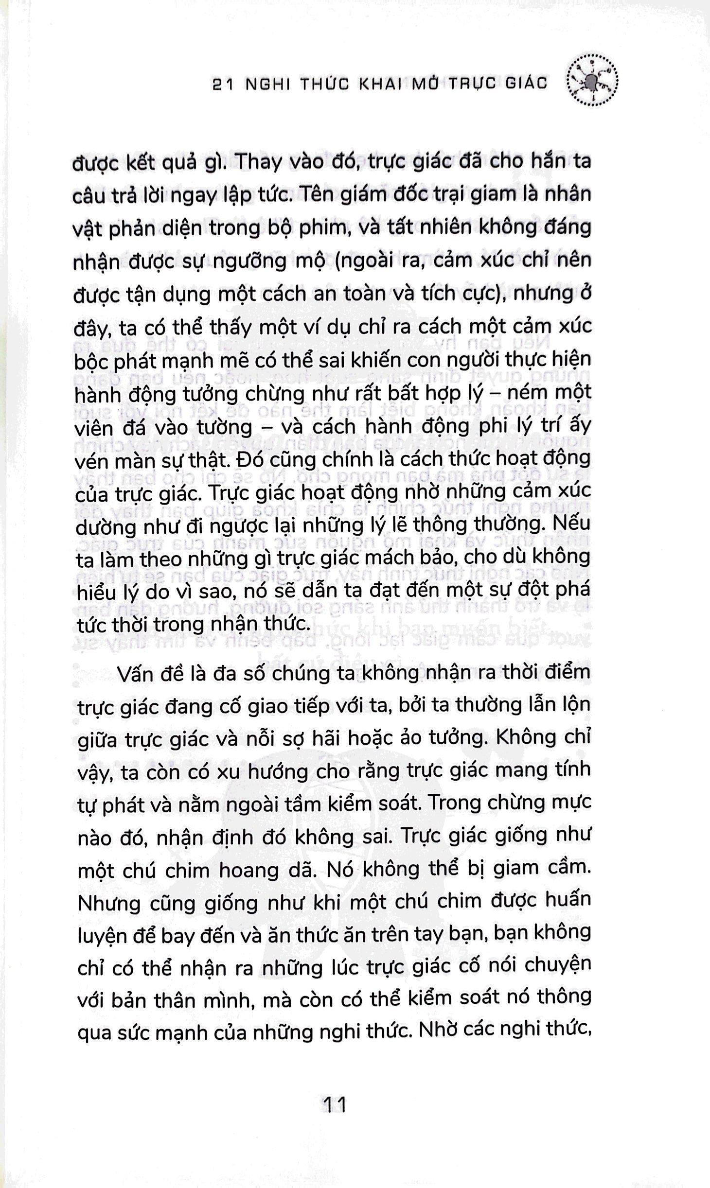 Mua tại Tiktok21 Nghi Thức Khai Mở Trực Giác Bạn đã từng được cứu mạng trong một tình huống nguy hiểm nhờ nghe theo giọng nói bí ẩn trong đầu mình chưa? Bạn có từng cảm thấy bồn chồn trong bụng hoặc bị đau dạ dày khi gặp ai đó? Bạn có từng tung đồng xu để quyết định một vấn đề khó khăn nào chưa? Nếu câu trả lời là “Có”, hẳn bạn không quá xa lạ với khái niệm “trực giác”. Nhưng chính xác thì “trực giác” là gì? Có quan hệ gì với ta và giúp ích gì cho cuộc sống của ta? Ta giao tiếp với trực giác bằng cách nào? Quyển sách 21 Nghi Thức Khai Mở Trực Giác sẽ giúp bạn trả lời những câu hỏi này.