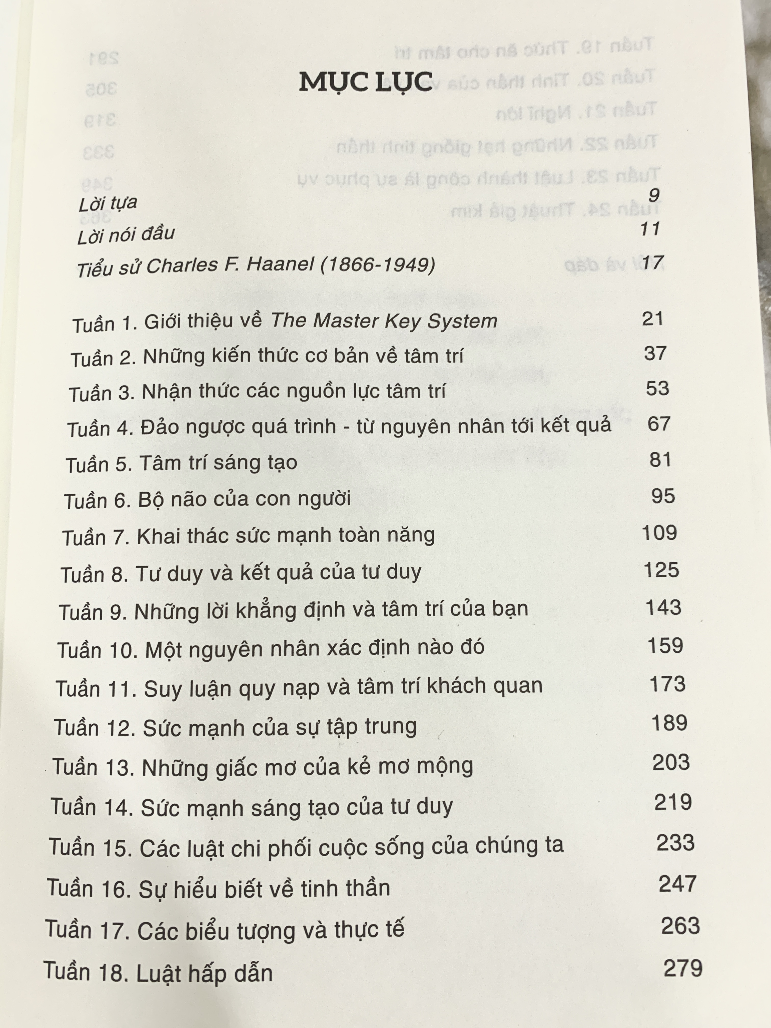 • Xây dựng “tư duy triệu phú” giúp bạn kiếm tiền và tích lũy thêm ngày càng nhiều tiền. Bạn sẽ tìm thấy tất cả những gì mình cần để đạt được thành công trong những trang sách này. Tôi có thể tự tin khẳng định điều trên. Khi bắt tay vào thực hành những điều mà bạn học được ở đây, bạn sẽ phát hiện ra rằng không gì có thể ngăn bước chân bạn, và tất cả những điều mà bạn hằng mơ ước đều sẽ trở thành một khả năng nằm trong tầm với. Mục lục: Lời tựa – Trang số 9 Lời nói đầu – Trang 11 Tiểu sử Charles F. Haanel (1866-1949) – Trang 17 Tuần 1. Giới thiệu về The Master Key System – Trang 21 Tuần 2. Những kiến thức cơ bản về tâm trí – Trang 37 Tuần 3. Nhận thức các nguồn lực tâm trí 53 Tuần 4. Đảo ngược quá trình – từ nguyên nhân tới kết quả Tuần 5. Tâm trí sáng tạo Tuần 6. Bộ não của con người Tuần 7. Khai thác sức mạnh toàn năng Tuần 8. Tư duy và kết quả của tư duy Tuần 9. Những lời khẳng định và tâm trí của bạn Tuần 10. Một nguyên nhân xác định nào đó Tuần 11. Suy luận quy nạp và tâm trí khách quan Tuần 12. Sức mạnh của sự tập trung Tuần 13. Những giấc mơ của kẻ mơ mộng Tuần 14. Sức mạnh sáng tạo của tư duy Tuần 15. Các luật chi phối cuộc sống của chúng ta Tuần 16. Sự hiểu biết về tinh thần Tuần 17. Các biểu tượng và thực tế Tuần 18. Luật hấp dẫn Tuần 19. Thức ăn cho tâm trí Tuần 20. Tinh thần của vạn vật Tuần 21. Nghĩ lớn Tuần 22. Những hạt giống tinh thần Tuần 23. Luật thành công là sự phục vụ Tuần 24. Thuật giả kim Hỏi và đáp