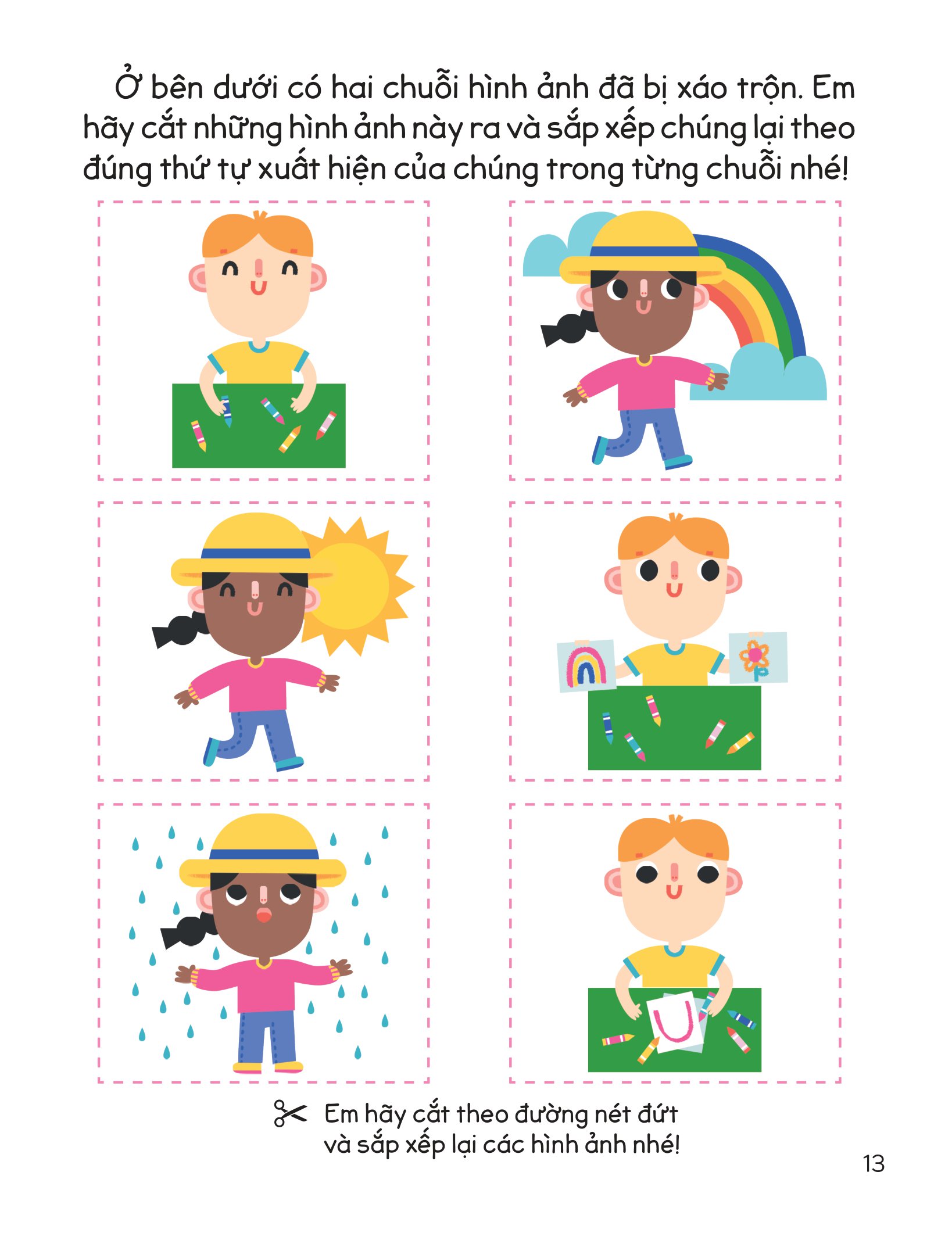 Đồng thời, các hoạt động trong sách cũng kích thích trí não của em, giúp em phát triển nhận thức thị giác, kỹ năng vận động tinh và sự phối hợp tay-mắt đấy.