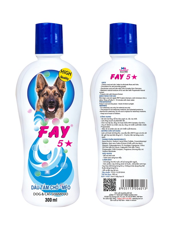 Mỗi sao của Dầu Tắm Chó Mèo FAY là một tính năng: FAY 5 Sao với đầy đủ 5 tính năng: - Vệ sinh da lông, hỗ trợ làm sạch ve, rận, bọ chét. -