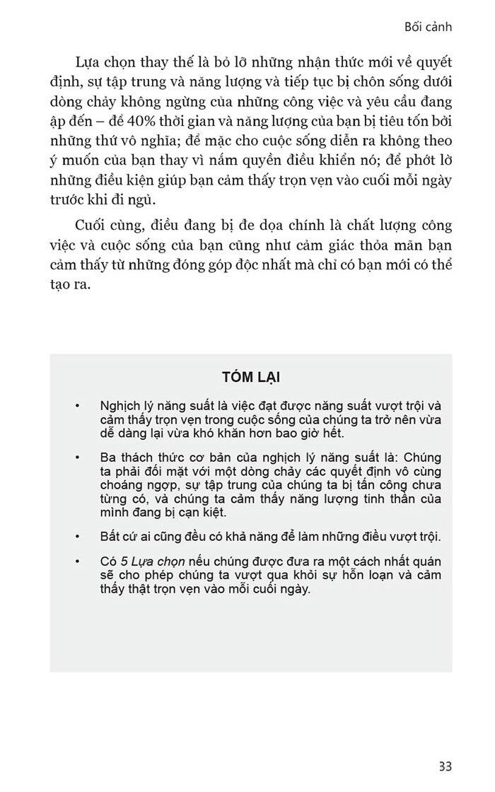 5 Lựa Chọn Cho Năng Suất Vượt Trội “Không ai thấu hiểu việc quản lý thời gian và năng suất hơn những nhà nghiên cứu và chuyên gia tư vấn của Franklin Covey. “5 Lựa chọn” mang đến những hiểu biết mới lạ, thú vị, và hơn tất cả là những hiểu biết sâu sắc và vô cùng thiết thực, có thể giúp bạn xử lý lượng công việc choáng ngợp và nhận ra toàn bộ tiềm năng của mình, cả trong công việc và cuộc sống” - TS. Heidi Grant Halvorson, Phó giám đốc, Trung tâm Khoa học Động lực, Trường Kinh doanh Columbia, tác giả cuốn sách bán chạy nhất: 9 Things Successful People Do Differently/ 9 hành động khác biệt của người thành công “Một cuốn sách rất thức thời, phù hợp với nhu cầu thực tế trong thời kỳ đầy biến động nhưng giàu cơ hội này” - Steve Forbes, Chủ tịch và Tổng biên tập, Forbes Media “’5 Lựa chọn’ là một tổng kết tuyệt vời của những gì mà chúng ta biết về bộ não cũng như việc quản trị sự chú tâm của mình. Nó đưa ra rất nhiều nghiên cứu phức tạp vào một tập hợp các bước rất dễ tiếp cận, dễ hiểu, và thiết thực để giúp mọi người làm việc đạt năng suất cao hơn ở mọi lĩnh vực” - TS. David Rock, Giám đốc, Viện nghiên cứu Lãnh đạo Thần kinh học. Điều khiến bạn cầm cuốn sách "5 Lựa Chọn Cho Năng Suất Vượt Trội" trên tay, có thể là một trong hai lý do sau đây: Bạn đang tìm kiếm một vài ý tưởng để có thể trở nên hiệu quả hơn. Có thể bạn đang xoay sở khá tốt, nhưng bạn muốn cải thiện. Bạn muốn quản lý thời gian của mình tốt hơn, làm được nhiều việc hơn mỗi ngày. Bạn có thể muốn tạo ra nhiều khác biệt hơn, để được thăng tiến trong sự nghiệp. Để có được nhiều thời gian hơn cho những người quan trọng của mình, hoặc để đạt được những mục tiêu tối quan trọng. Bạn cảm thấy như bị chôn sống mỗi ngày và thực sự cần sự giúp đỡ nghiêm túc. Tuy nhiên, điều bạn cảm thấy sẽ giống với Jaivon nhiều hơn – vật lộn để đứng vững trên ngọn núi công việc cần phải làm mỗi ngày mỗi lúc một cao, hàng loạt những yêu cầu và quyết định không ngừng ập đến khiến bạn cảm thấy mất cân bằng và hiếm khi có thời gian dành cho mình. Bạn có thể cảm thấy sức khỏe và những mối quan hệ của mình đang bị tổn hại trong khi mục tiêu chính của bạn chỉ là xoay sở làm sao để vượt qua một ngày mà vẫn còn nguyên vẹn. Bạn biết rằng nếu hiện trạng này không sớm thay đổi thì chắc có lẽ bạn sẽ bị nổ tung mất thôi. Mục đích của cuốn sách "5 Lựa Chọn Cho Năng Suất Vượt Trội" là để giúp bạn thoát ra khỏi ngọn núi đó, hít thở không khí trong lành thật sâu, và giành lại cuộc sống của mình. Chúng tôi sẽ giúp bạn tìm thấy đường ra bằng cách cung cấp cho bạn những nguyên lý, quy trình và công cụ để bạn có thể xoay chuyển tình thế - vượt qua sự chuyên chế của dòng chảy công việc vô tận không ngừng ập tới. Đây không phải là những công thức ma thuật có tác dụng tức thì. Chúng đòi hỏi nhiều nỗ lực, mỗi chương chứa đựng rất nhiều điều đơn giản nhưng đầy uy lực mà bạn có thể áp dụng ngay lập tức và tạo ra tác động đáng kể đến cuộc sống của bạn.