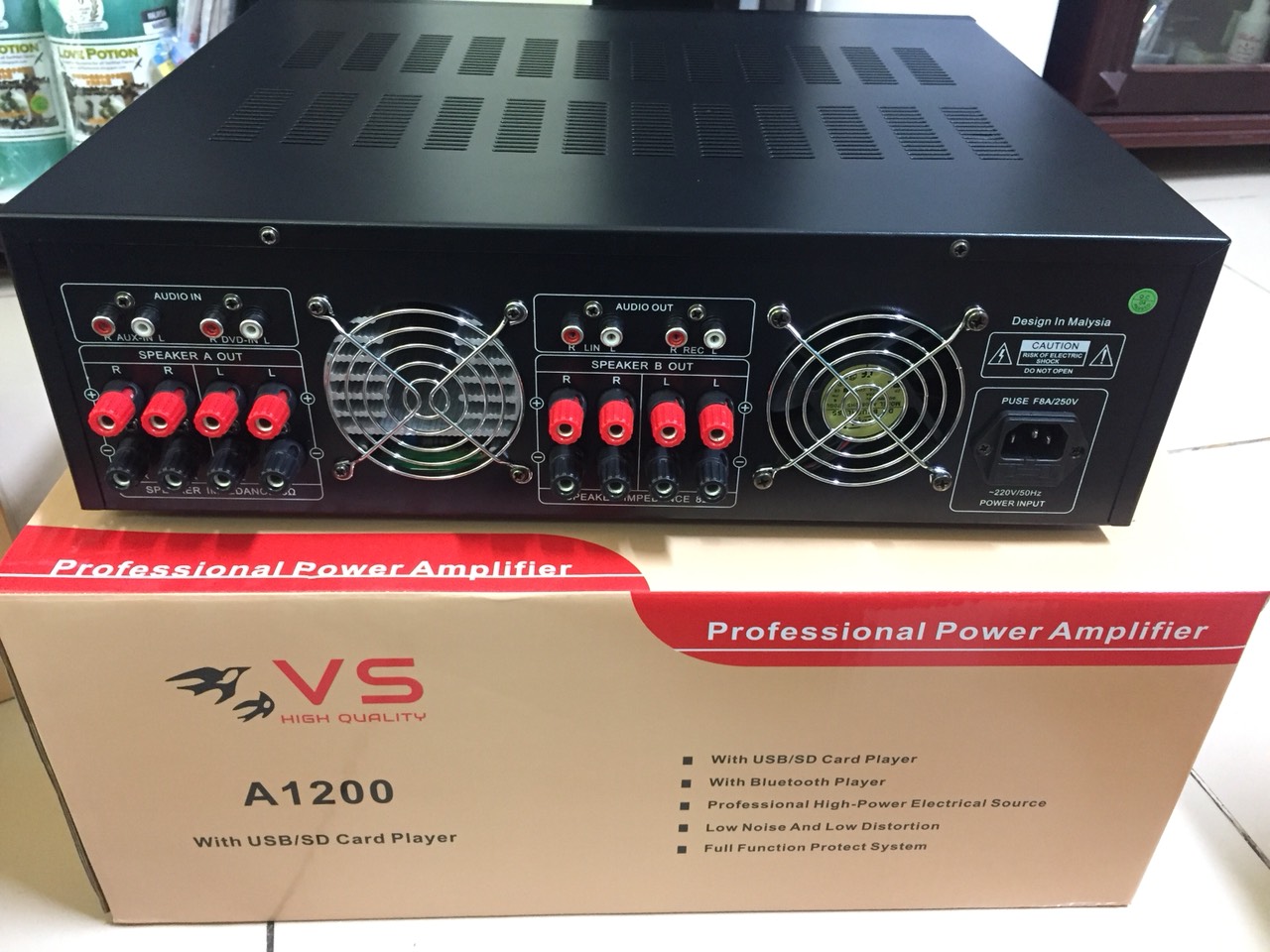 - Amply VS A1200 thiết kế theo tiêu chuẩn chuyên nghiệp giúp cho chủ đầu tư tiết kiệm giá thành và điện năng, nhưng lại bền bỉ và phù hợp cho các nhà yến diện tích lớn.
