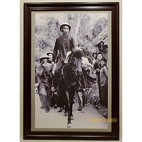 Ảnh gốc đen trắng in dầu – Bác Hồ cưỡi ngựa. Chất liệu tranh in dầu trên lụa cao cấp được phủ lớp pe bảo vệ bề mặt tranh, ép trên tấm pomex dày 5mm