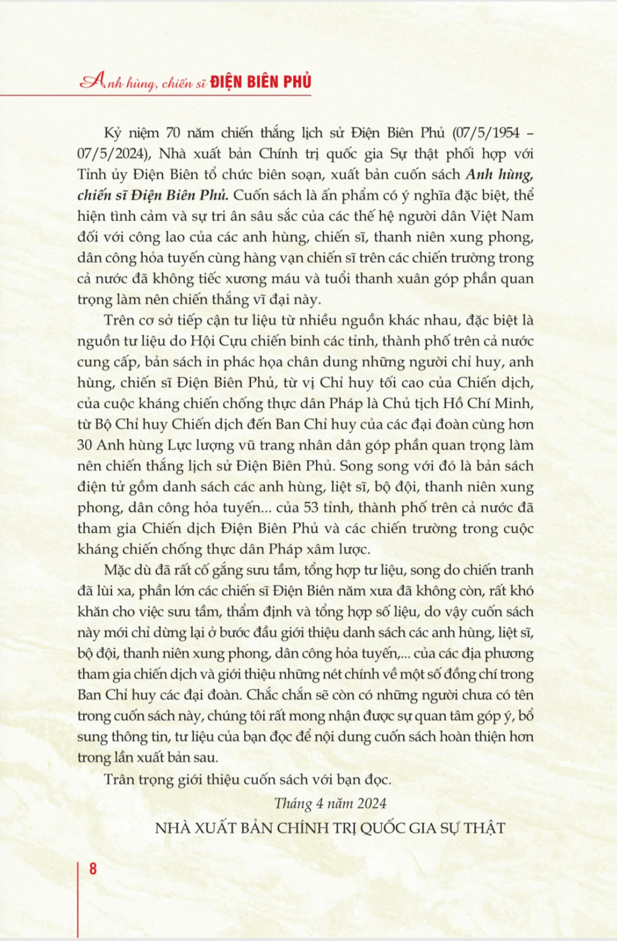 Kỷ niệm 70 năm chiến thắng lịch sử Điện Biên Phủ (07/5/1954 - 07/5/2024), Nhà xuất bản Chính trị quốc gia Sự thật phối hợp với Tỉnh ủy Điện Biên tổ chức biên soạn, xuất bản cuốn sách Anh hùng, chiến sĩ Điện Biên Phủ. Cuốn sách là ấn phẩm có ý nghĩa đặc biệt quan trọng, thể hiện tình cảm và sự tri ân sâu sắc của các thế hệ người dân Việt Nam đối với công lao của các anh hùng, liệt sĩ đã anh dũng hy sinh xương máu và tuổi thanh xuân cho chiến thắng vĩ đại này.