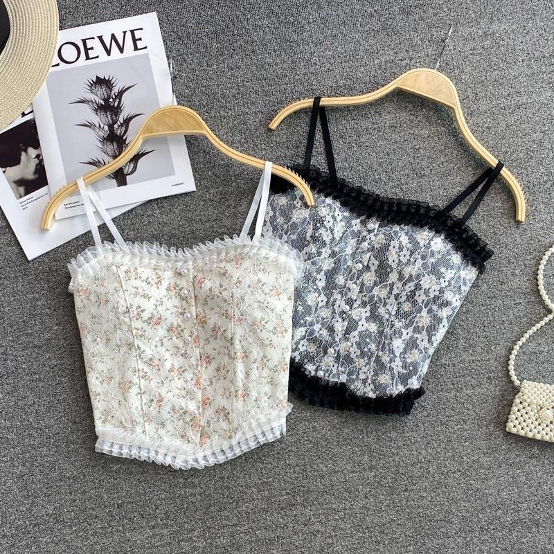 ✨Áo 2 Dây Nữ Ren Hoa Tiểu Thư Đính Hạt Viền Bèo, Chun Sau Dáng Croptop Siêu Sang Chảnh Có Mút Ngực 1202