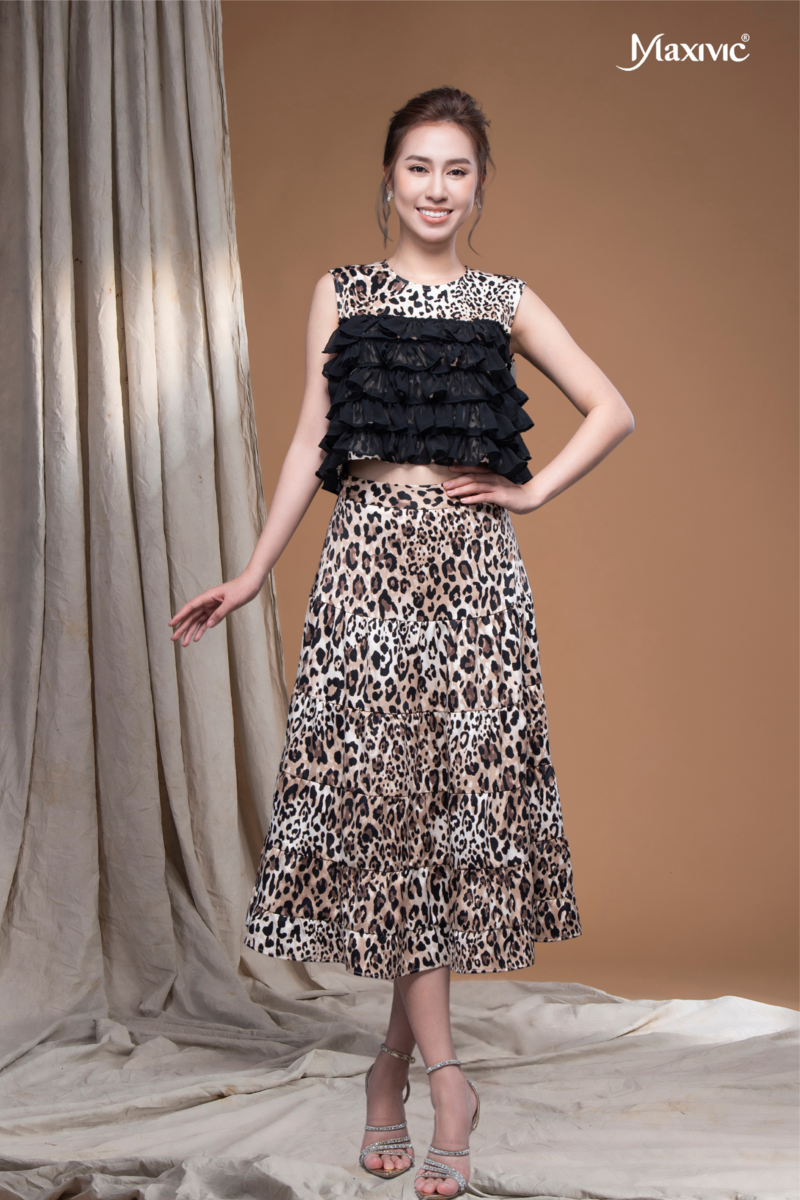 - Thiết kế áo croptop sát nách hoạ tiết da beo cùng phần bèo voan xếp tầng, mang lại diện mạo nữ tính và thu hút.