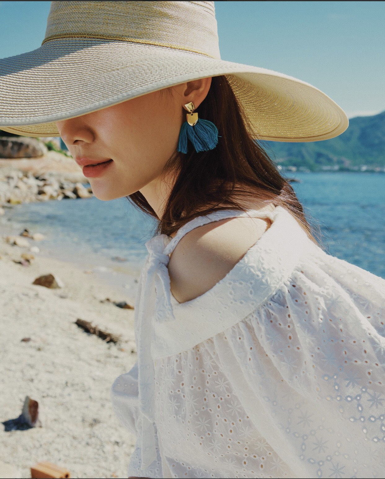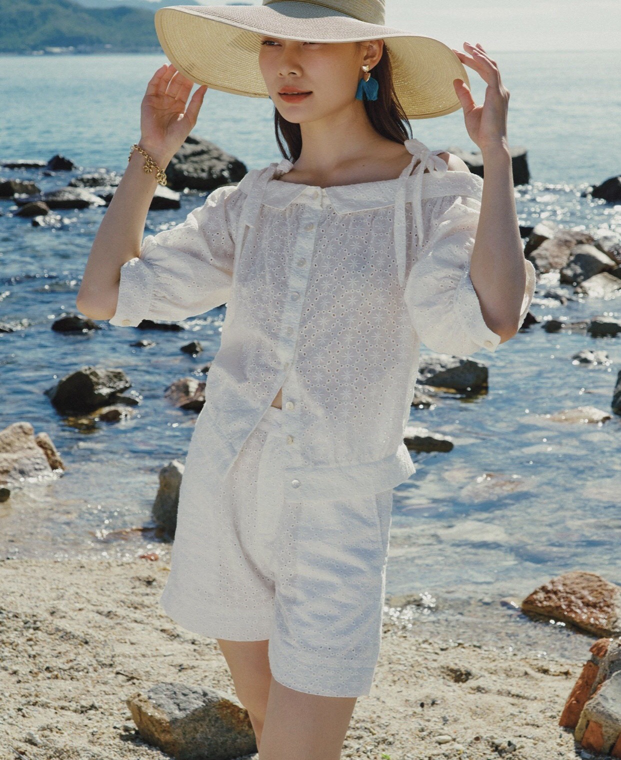 Thiết kế áo trễ vai croptop thắt nơ vai phối chung với quần đồng bộ cotton thêu trắng có thể kết hợp với nhiều phụ kiện khác nhau như sandal, giày cao gót, túi xách,... tạo nên phong cách thời trang đa dạng, phù hợp cho nhiều hoàn cảnh khác nhau.