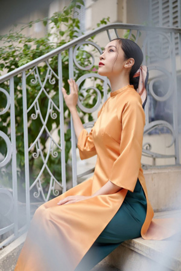 áo dài cách tân form suông được may bằng chất liệu lụa gấm loại 1 màu cam nhẹ nhàng, kết hoa thủ công, tay lỡ loe