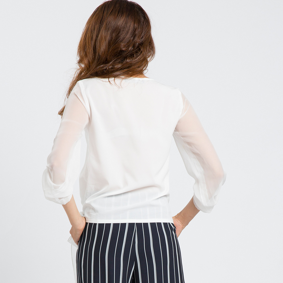- kiểu áo đắp thân trước, thắt nơ bên hông, cài nút đính phần ngực
