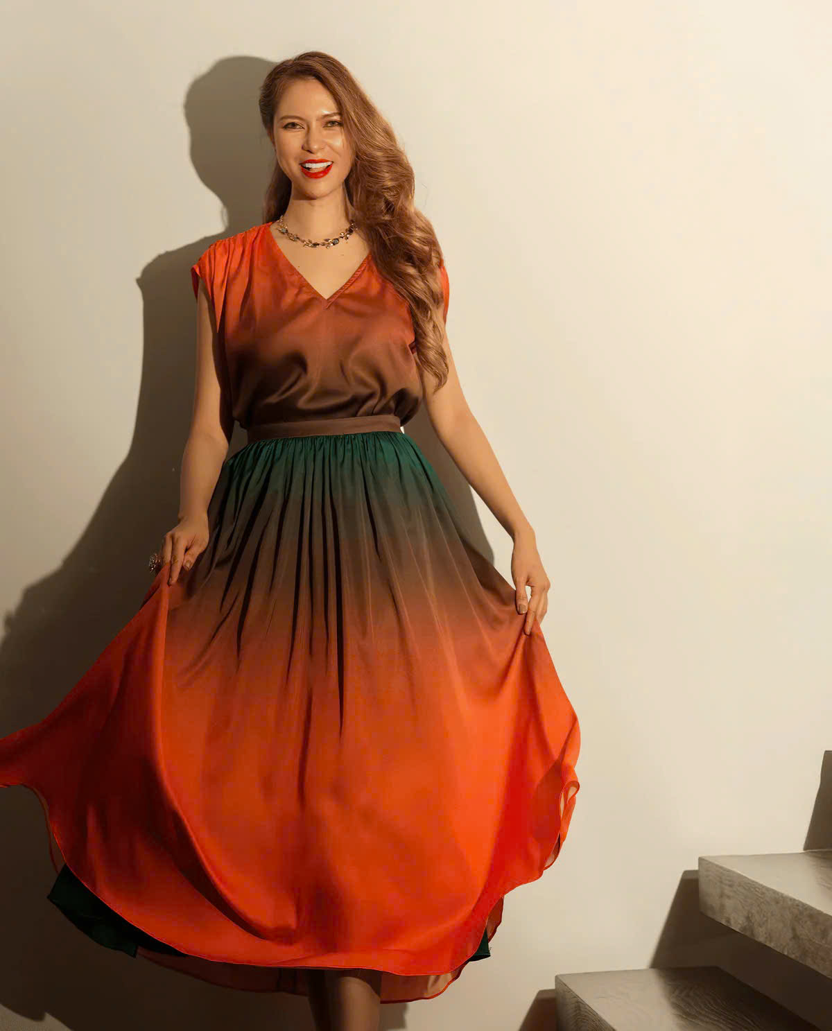 Chất liệu chính: Polyester, xuất xứ Trung Quốc Trong một buổi chiều khi ánh nắng dần lịm xuống nơi sườn đồi, tôi đã khoác lên không gian sắc màu của cảm xúc chiều tà. Bộ