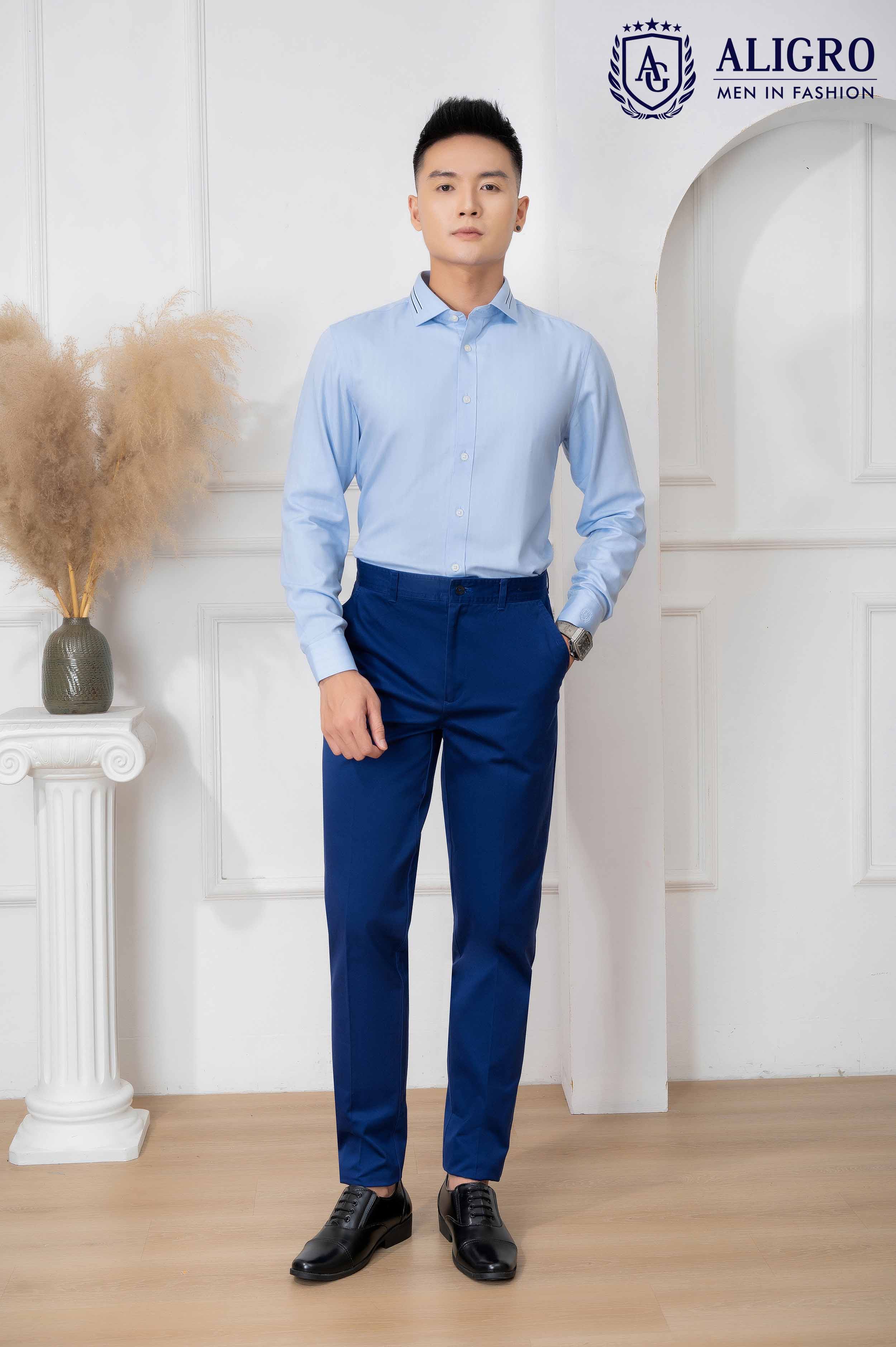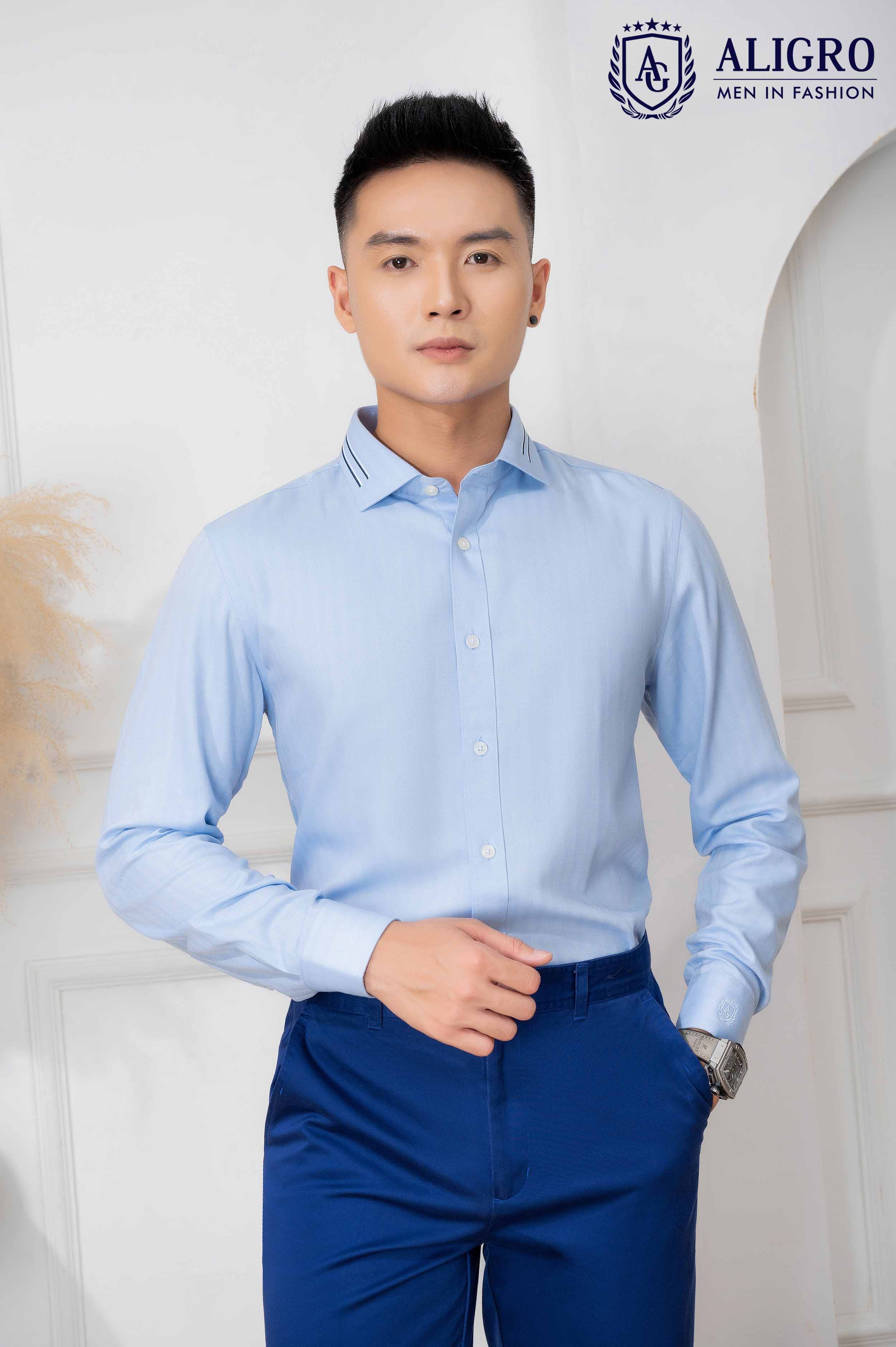 ✨Áo sơ mi nam dài tay ALIGRO 100% chất bamboo Màu Xanh phối cổ bẻ dáng ôm body ALGS214