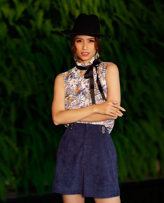 Áo kiểu dáng suông Không tay Cổ cao viền bèo, ruy băng gân viền thắt nơ cổ Cài bằng nút phía sau Chất liệu chính: Polyester Ruy băng gân Polyester Cắt may thủ công tinh