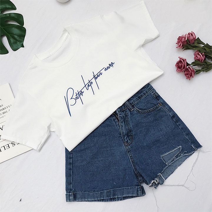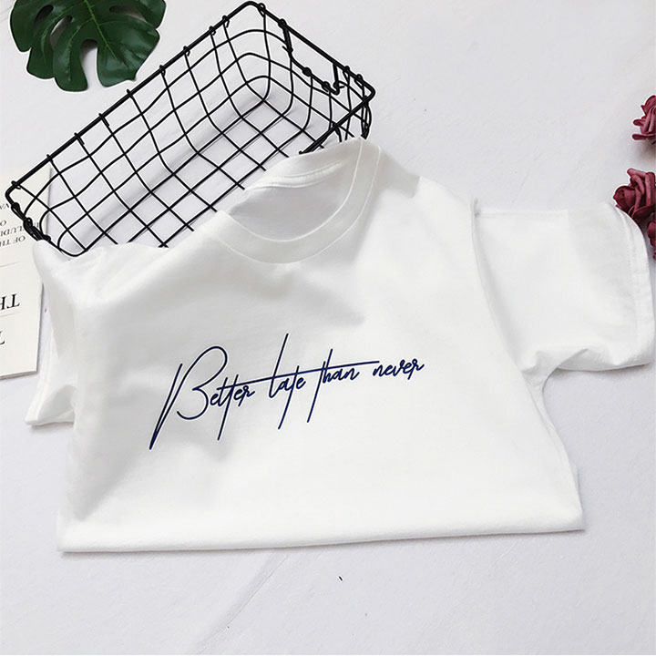 - Áo thun nữ in Better Late Than Never được thiết kế với kiểu dáng hợp thời trang hiện đại. Chất liệu áo thun với cotton mềm mịn và thoáng mát, cùng với độ co