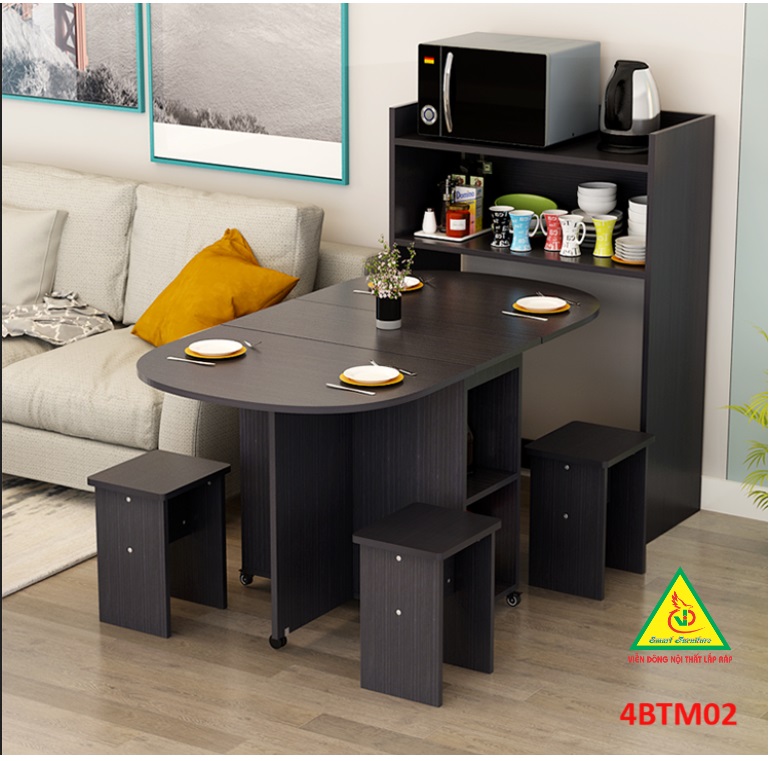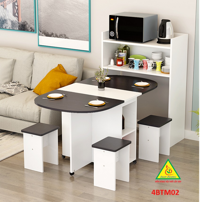Bàn ăn gấp gọn thông minh Với các gia đình có diện tích phòng ăn không lớn lắm thì Bàn ăn gấp gọn này chính là sự lựa chọn lý tưởng nhất. Bàn ăn có kích thước nhỏ gọn, kết cấu thông minh có thể gấp gọn lại khi không sử dụng tiết kiệm diện tích. Bàn được làm bằng gỗ công nghiệp MDF cao cấp phủ melamine láng mịn, tính thẩm mỹ cao thu hút được sự chú ý của khách hàng. Tích hợp 3 in 1: Bàn, Tủ và Kệ thật Sang - Chảnh - Đẳng Cấp Dù nhà lớn hay nhỏ thì chiếc Bàn Ăn Thông Minh sẽ làm không gian gọn gàng hơn, thoáng hơn và đẹp hơn.
