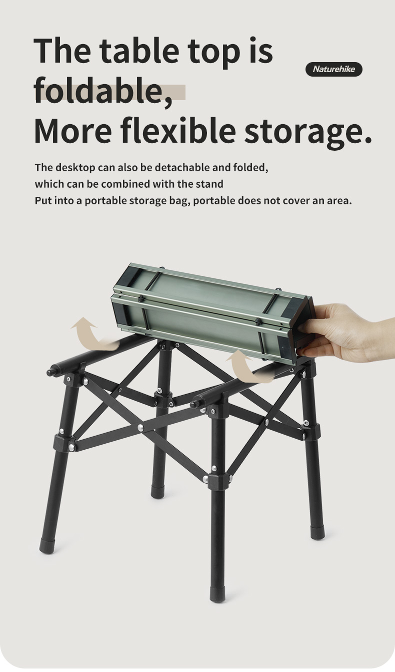 NatureHike CNH22JU038 chất liệu hợp kim nhôm vân gỗ nhẹ, bền và vô cùng sang trọng. Thiết kế khung bàn chữ X hỗ trợ ổn định hơn, tải trọng cao tới 30kg. Khung bàn có thể