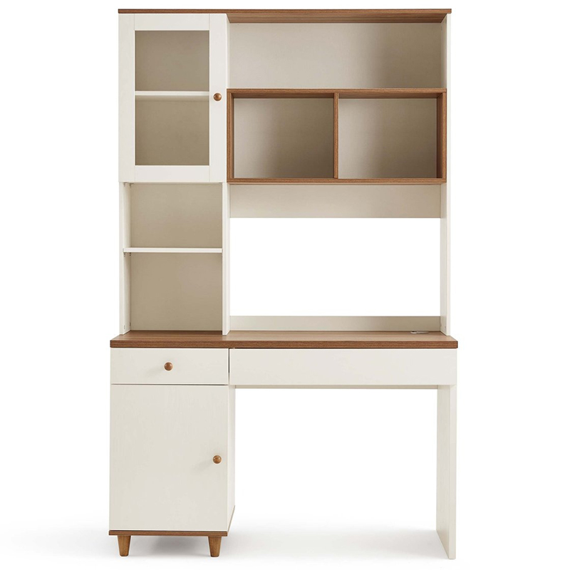 • Bàn làm việc thiết kế với hệ kệ sách lớn nhiều ngăn phía trên và hệ tủ cánh kính có tay nắm gỗ thẩm mỹ