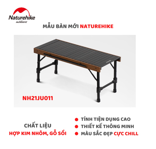 NatureHike CNH22JU038 chất liệu hợp kim nhôm vân gỗ nhẹ, bền và vô cùng sang trọng. Thiết kế khung bàn chữ X hỗ trợ ổn định hơn, tải trọng cao tới 30kg. Khung bàn có thể