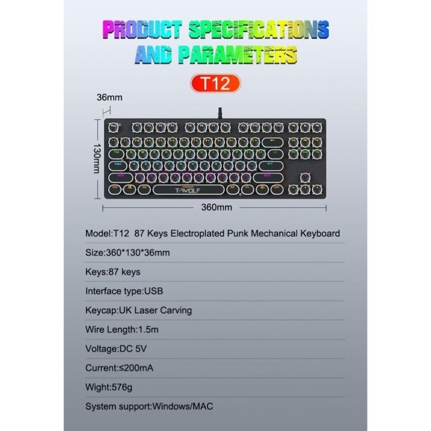 Mô tả sản phẩm Bàn Phím cơ T-Wolf T12, Blue Switch, USB, LED, 87 Gaming bảo hành 12 tháng