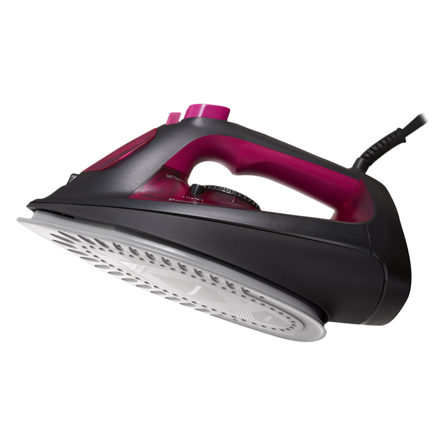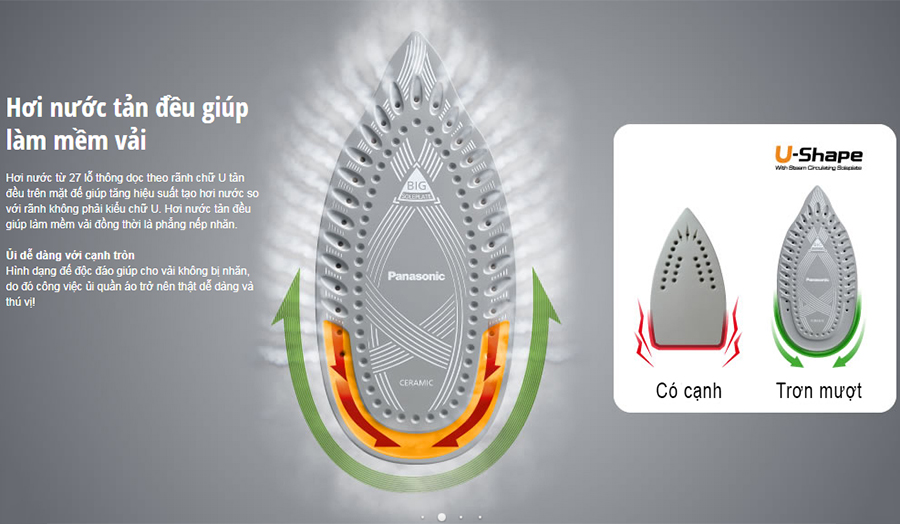 Bàn ủi trang bị 27 lỗ thông dọc theo rãnh chữ U tản đều trên mặt đế giúp tăng hiệu suất tạo hơi nước, hệ thống hơi nước Power Shot phun lượng lớn hơi nươc tập trung, giúp làm mềm vải và làm phẳng các nếp nhăn nhanh chóng và còn có thể loại bỏ mùi hôi bám vào quần áo khó giặt như những trang phục comle, Hình dạng đế độc đáo với các cạnh tròn và cấu tạo đế viền cong giúp ủi áo không bị vướng, không làm cho vải co lại, cho việc là quần áo 1 cách dễ dàng và thoải mái.