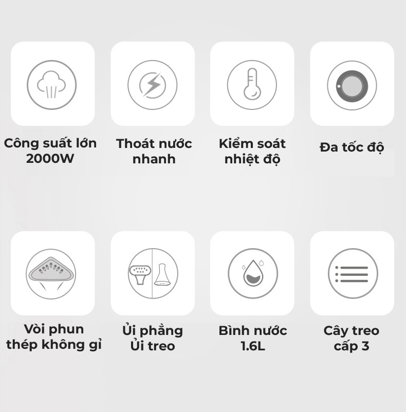 Đặc điểm nổi bật Thiết kế hiện đại, dễ dàng di chuyển và cất giữ Công suất 2000W làm nóng nhanh, tiết kiệm thời gian ủi 3 mức điều chỉnh hơi nước cùng đầu ủi nhọn