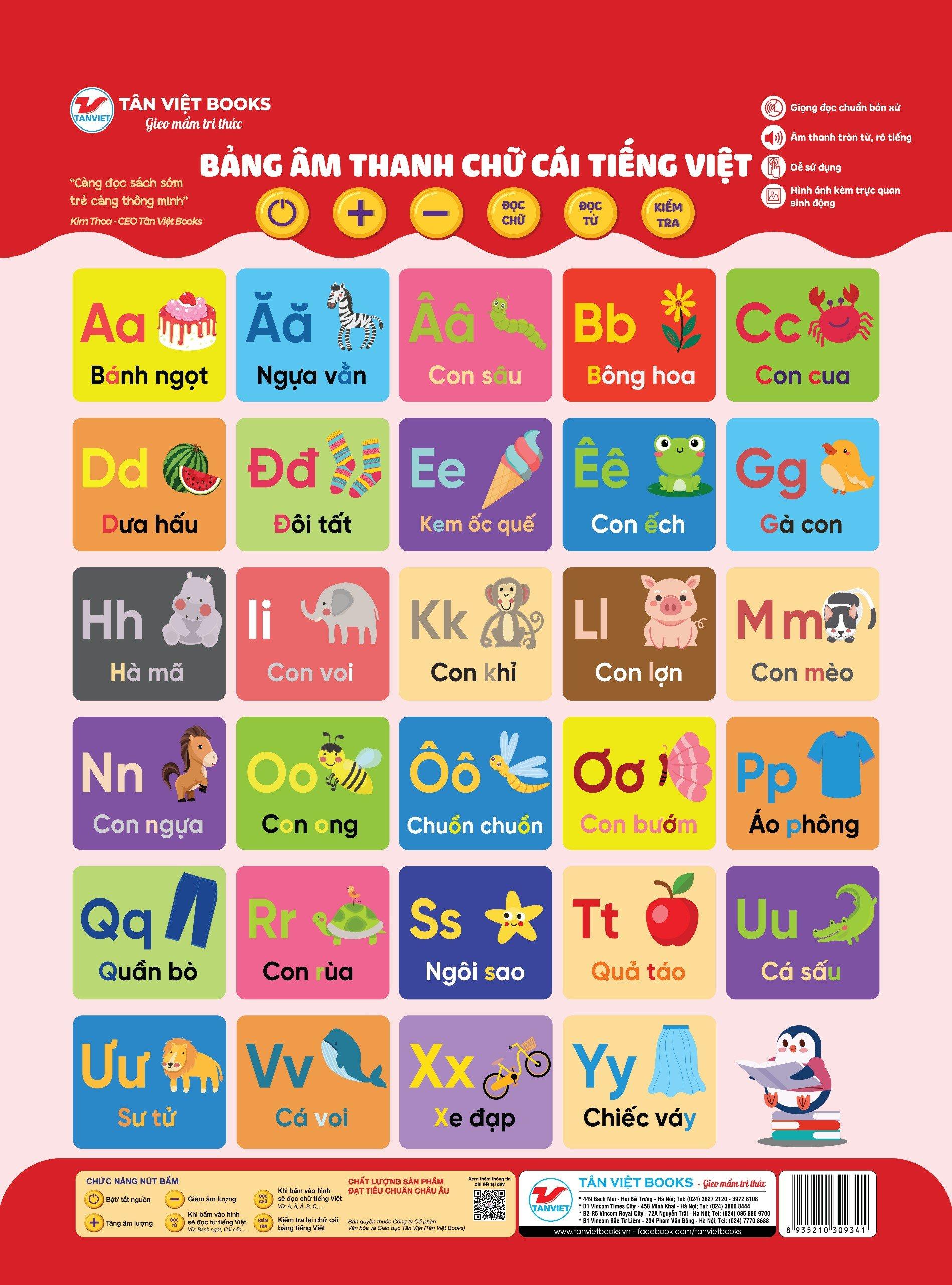 Bảng âm thanh là bộ sản phẩm công nghệ giáo dục được Tân Việt Books phát hành vào tháng 6/2024, đúng dịp nghỉ hè của các em học sinh mầm non và tiểu học. Bộ sản phẩm thú vị này bao gồm 5 bảng với 5 chủ đề quen thuộc, thiết thực cho bé như: Bảng chữ cái tiếng Anh, Bảng chữ cái tiếng Việt, Bảng số đếm, Bảng Động vật và Bảng Rau củ quả.