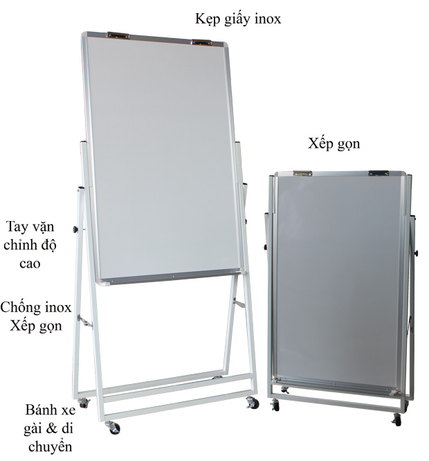 Bảng kích thước 80x120cm , mặt bảng kẹp được giấy A0, viết dễ xóa BẢNG: - Mặt bảng: màu trắng viết bút lông Poly Taiwan: không lem & không dính mực sau khi xóa, không kẻ