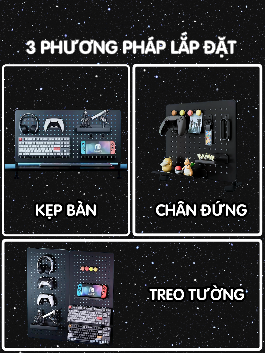 Bảng pegboard có chức năng 3 trong 1, vừa để được chân đứng, vừa kẹp bàn và có thể treo tường 1 cách dễ dàng và linh động.
