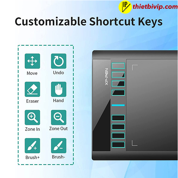 XP-Pen Star03 với 8 nút bấm có thể thiết lập mọi thao tác phím tắt giúp tối thiểu nhu cầu dùng bàn phím ngoài, hỗ trợ các tính năng chỉnh sửa bạn hay xài và các tổ hợp phím khác như Ctrl+S (Save), Ctrl+X (Undo), từ đầu, XP-Pen Star 03 đã được thiết lập các tính năng mặc định: Brush enhance/weaken, zoom-in/out, Undo, hand tool, brush tool, erase, tuy nhiên bạn có thể vào driver của máy để chỉnh lại. Hỗ trợ cả phím tắt như khi cần mở nhanh một chương trình hay website nào đó.