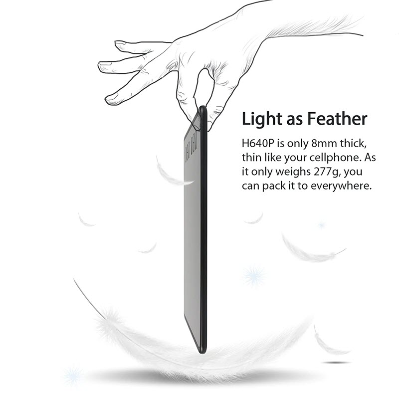 - Bút cảm ứng không dùng pin Khu vực làm việc 6,3 × 3,9 inch là đủ và nhỏ gọn, và toàn bộ bề mặt trên cùng được bao phủ bởi cùng một chất liệu. Đừng bao giờ lo lắng về việc sạc bút, đầu tiên các sản phẩm của H640P có bút cảm ứng không dùng pin.