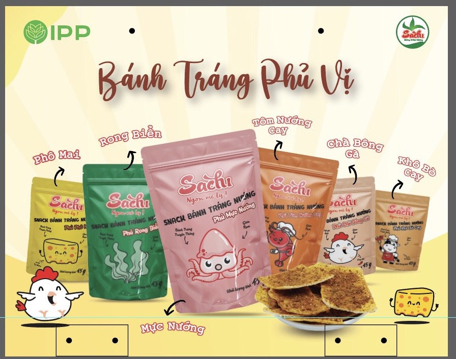 Sản phẩm bánh tráng dừa nướng tẩm khô bò, phô mai, chà bông gà, khô mực, tôm tẩm, rong biển của Sachi với các thành phần chính là bánh tráng dừa, nguyên liệu và nhờ