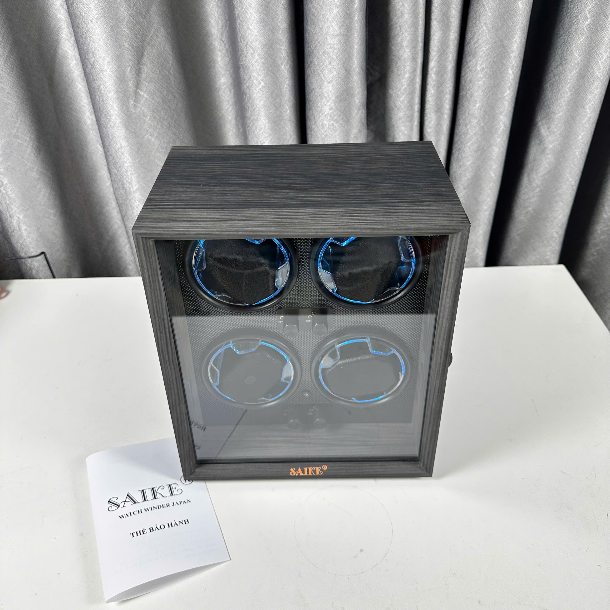 Thông tin sản phẩm: Hộp Xoay Đồng Hồ Cơ 4 Ngăn SAIKE S4001 Vỏ Gỗ - Có Đèn LED - SANG TRỌNG - Chất liệu: thân phôi là gỗ MDF, bảng bên trong là ABS