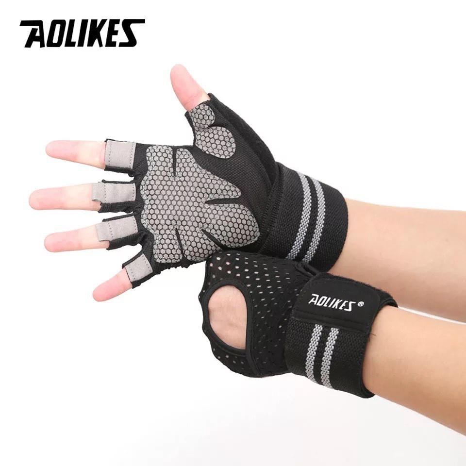 Găng tay tập gym AOLIKES 7639 hở mu bảo vệ lòng bàn tay sport wrist band - Đối tượng sử dụng: Gym, Yoga, thể dục dụng cụ, leo núi, võ thuật - Chất liệu: Silicon, Nylon