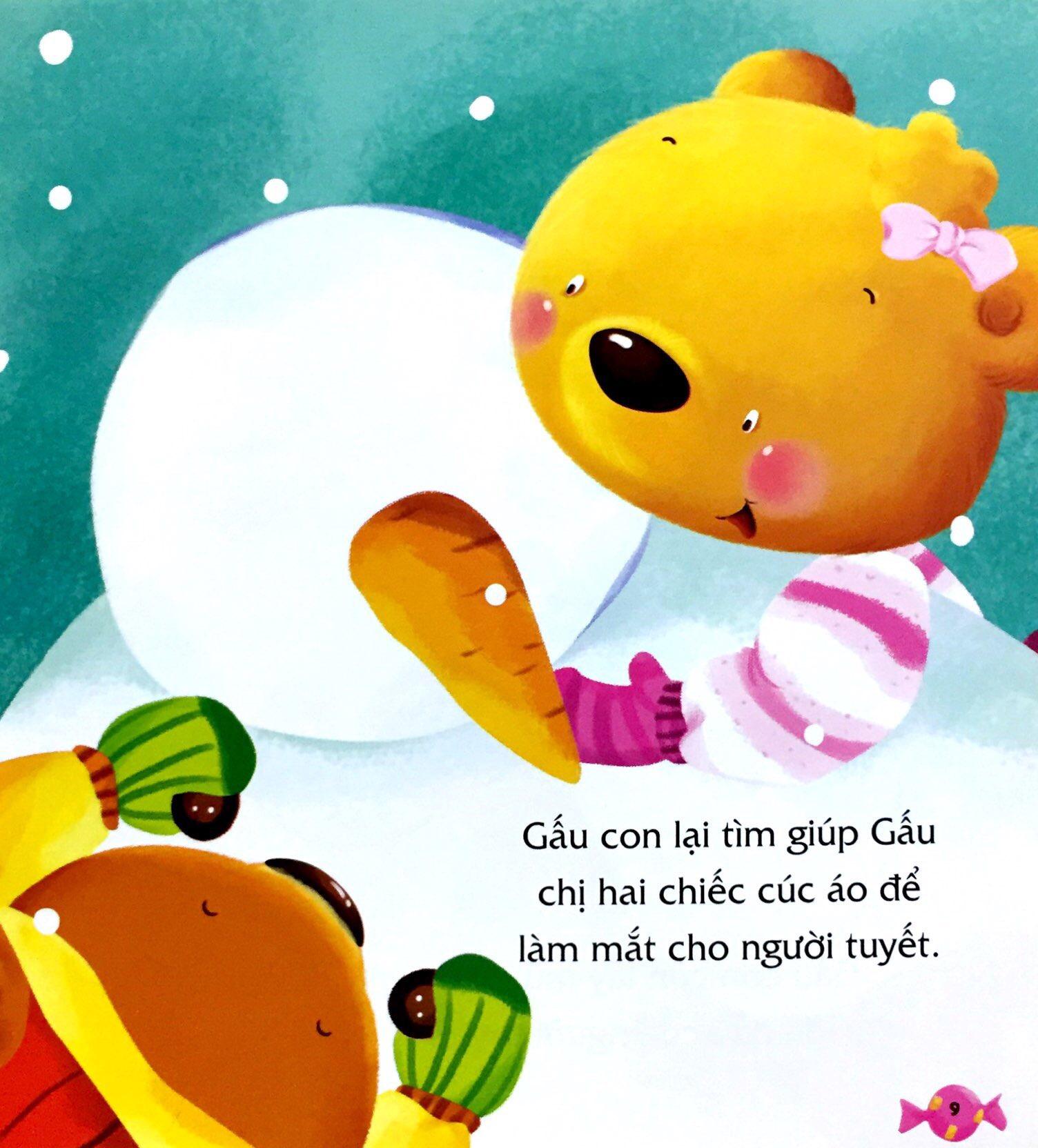 Gấu chị muốn đắp một người tuyết thật to. Nó liền bắt tay ngay vào làm thật nhanh, chẳng mấy chốc thân mình, hai vai… người tuyết đã xong rồi. Gấu con chạy ngay đi tìm củ cà rốt để làm mũi, hai cái cúc làm mắt cho người tuyết, nhờ đó mà người tuyết đáng yêu đã được hoàn thành rồi. Gấu chị liền cảm ơn cô em gái tốt bụng. Hai chị em gấu cùng cười vui vẻ.
