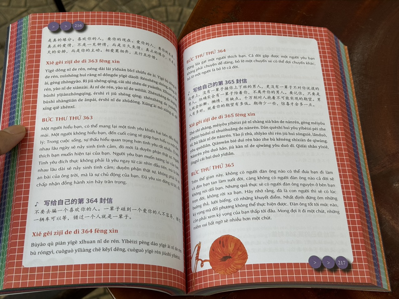 Giờ đây, nhằm đáp ứng nhu cầu của những độc giả có niềm yêu thích ngôn ngữ Trung Quốc, Vanvietbooks hân hạnh ra mắt “999 lá thư gửi cho chính mình” – Phiên bản Song ngữ toàn tập với đầy đủ 999 lá thư chỉ trong 1 cuốn sách duy nhất! Được lấy cảm hứng từ chiếc tủ sách – tượng trưng cho nguồn kiến thức dồi dào, mới lạ đang chờ đón bạn khai phá - từng trang sách chính là từng ô tủ chứa đựng những lá thư thân quen không chỉ mang tính truyền cảm hứng sống mà còn “đính kèm” cả Hán tự và phiên âm được trình bày khoa học, hợp lý và đẹp mắt, là một công cụ rất tốt để giúp bạn đọc rèn luyện và nâng cao khả năng ngoại ngữ, trau dồi kiến thức, đúng với tiêu chí giúp bạn trở thành phiên bản hoàn hảo nhất của chính mình.