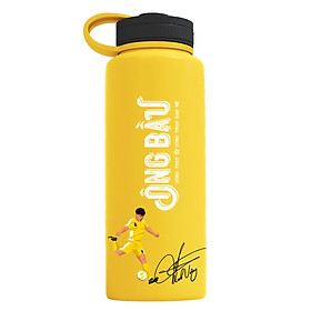 Bình Giữ Nhiệt Đam Mê lấy sắc vàng rực rỡ làm chủ đạo trên thân bình cùng những hình ảnh cách điệu và chữ kí của những “gương mặt vàng trong làng bóng đá" như cầu thủ Minh Vương, Công Phượng và Văn Toàn.