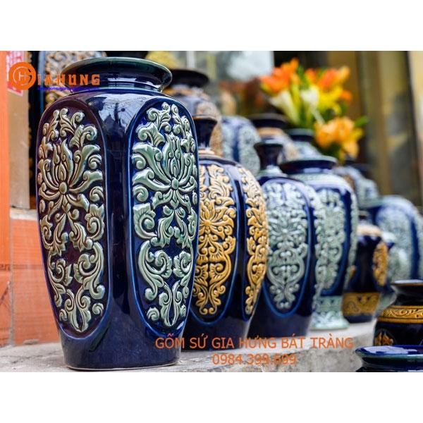 Bình hoa cao cấp Bát Tràng, hàng chuẩn loại 1, dáng chum họa tiết đắp nổi được thực hiện thủ công 100% bởi bàn tay lành nghề của các nghệ nhân làng nghề. Sản phẩm