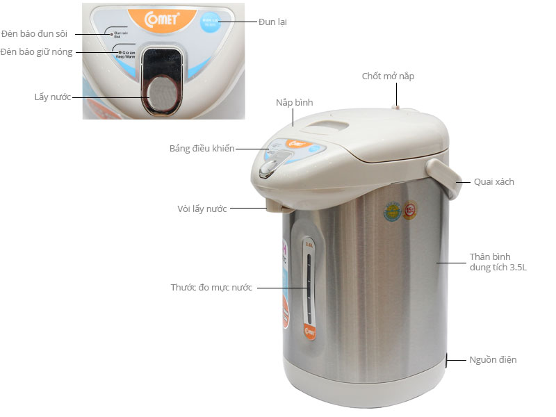 - Bình thủy điện Comet CM3216 dung tích 3.4 Lít với ruột bình bằng thép không gỉ an toàn cho sức khỏe, dễ dàng vệ sinh sau khi sử dụng. Trang bị bảng điều khiển bằng tiếng Việt dễ dàng khi sử dụng.