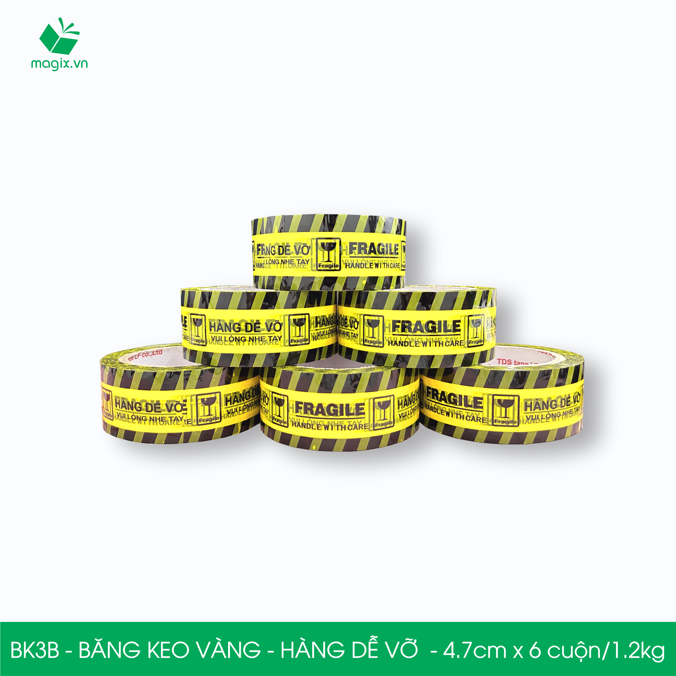 BK3A - Băng keo đục HÀNG DỄ VỠ - 4.8cm x Block 6 cuộn/kg Được sử dụng để thông báo đối với kiện hàng có sản phẩm là mặt hàng dễ vỡ cho đơn vị