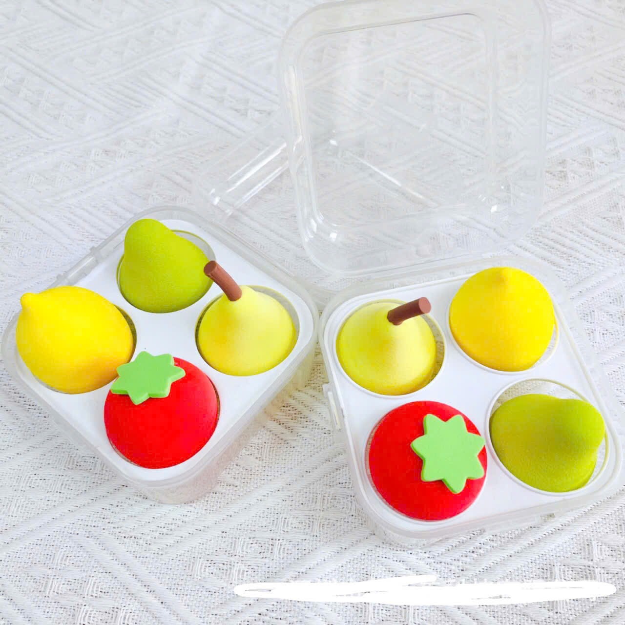 - Sét hộp 4 món tán phấn siêu mềm mại hình trái cây ,giọt nước , có độ đàn hồi cao , dẻo ,không bị biến dạng ,nhiều màu sắc cute xinh xắn đáng yêu