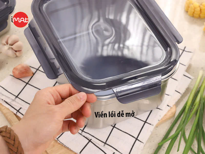 Nắp làm từ nhựa PP, thiết kế lõm xuống giúp xếp chồng lên nhau tiện lợi hơn và cũng nhắc nhở chúng ta không nên đựng thực phẩm đầy đến tận nắp.