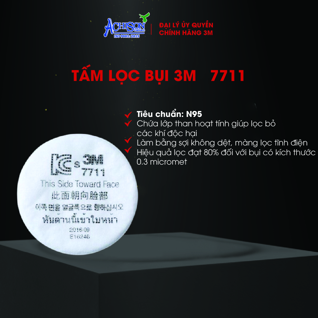 ***TẤM LỌC BỤI 3M 7711: THÔNG SỐ KỸ THUẬT: • Thương hiệu: 3M • Mã sản phẩm: 7711 • Công dụng: Sử dụng cùng với mặt nạ bảo vệ hô hấp dòng một phin lọc 3M • Tiêu chuẩn: N95   CÔNG DỤNG: • Chứa lớp than hoạt tính giúp lọc bỏ các khí độc hại trong môi trường • Được làm bằng sợi không dệt, màng lọc tĩnh điện • Hiệu quả lọc đạt 80% đối với bụi có kích thước 0.3 micromet • Ứng dụng: Sử dụng trong môi trường hóa chất có chứa hơi hữu cơ, khói hàn, bụi bẩn,…