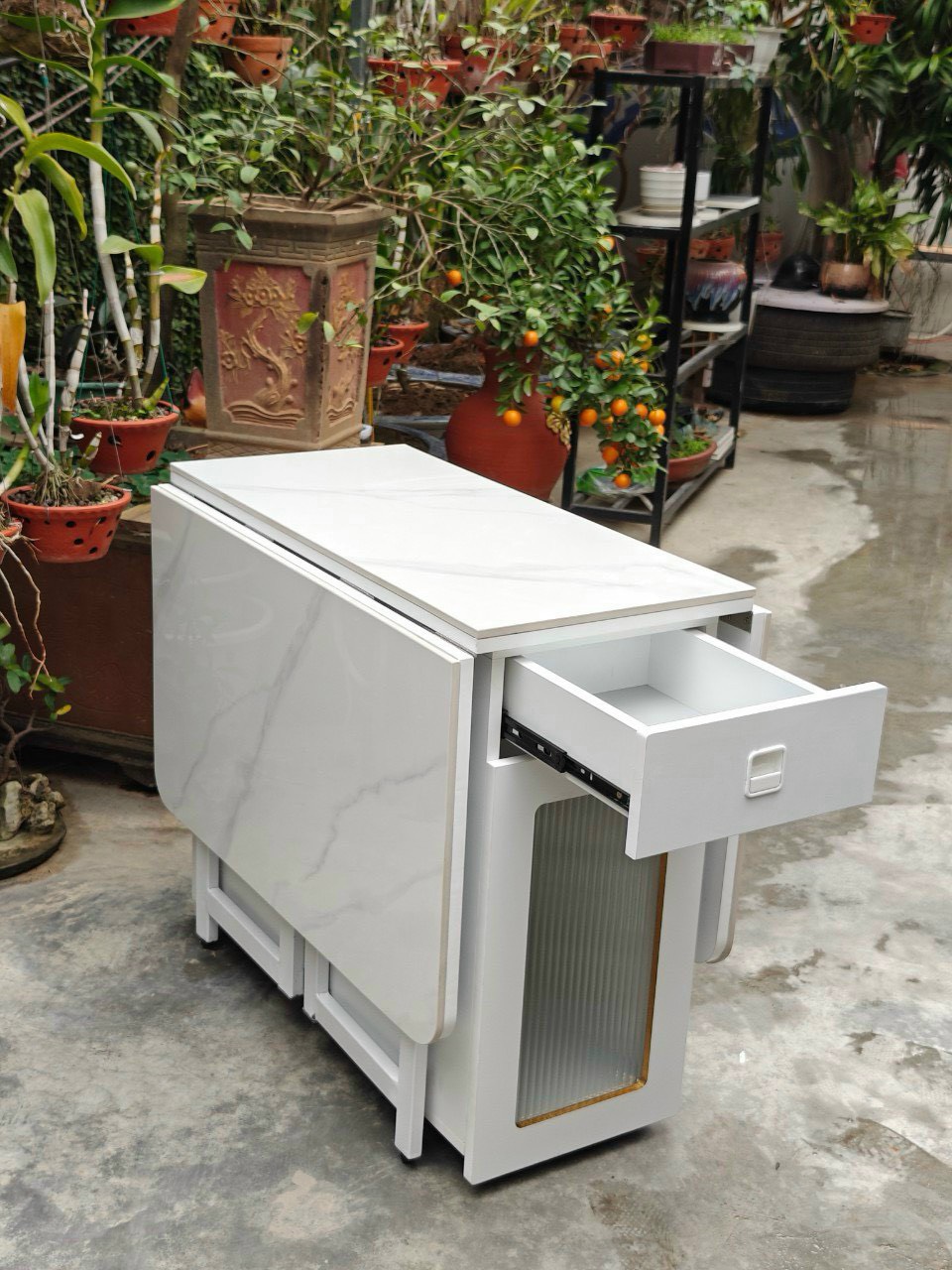 Bàn ăn thông minh gấp gọn tiện dụng giá tại xưởng ! Kích thước cụ thể: Khi mở rộng : Dài 1600 x Rộng 850 x Cao 750 Khi gấp gọn : Dài 850 x Rộng 4̉60 x Cao 750 Chất liệu Bàn : Thân gỗ MDF Thái chống ẩm. Chân thép tĩnh điện. Mặt đá CERAMIC chống xước chống ố.