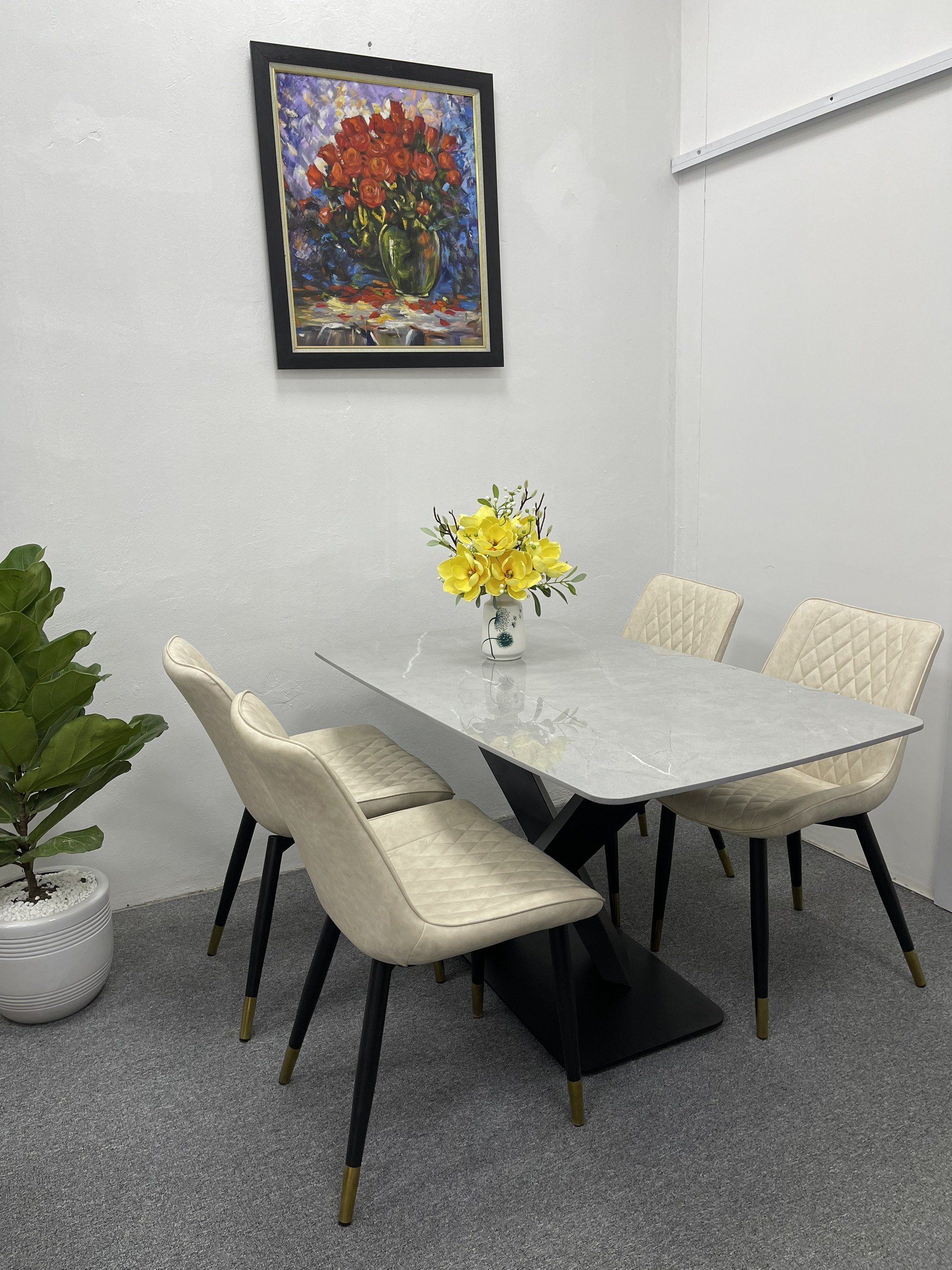 ✨Bộ bàn ghế phòng ăn Juno sofa mặt đá trắng vân mây chân chữ X, kèm 4 ghế chân mạ đồng