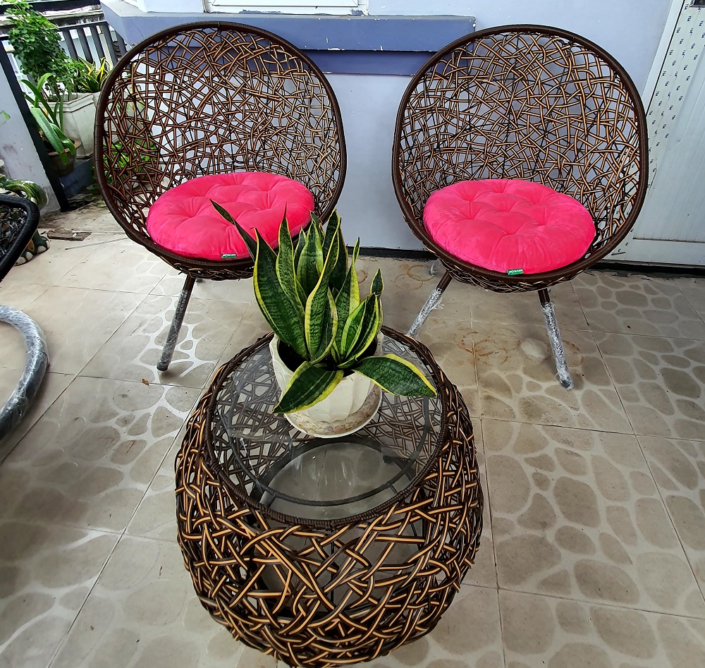 Chất liệu : sắt được tĩnh điện và được gia công sợi giả mây tăng tính thẩm mỹ và độ bền cao khi để ngoài trời