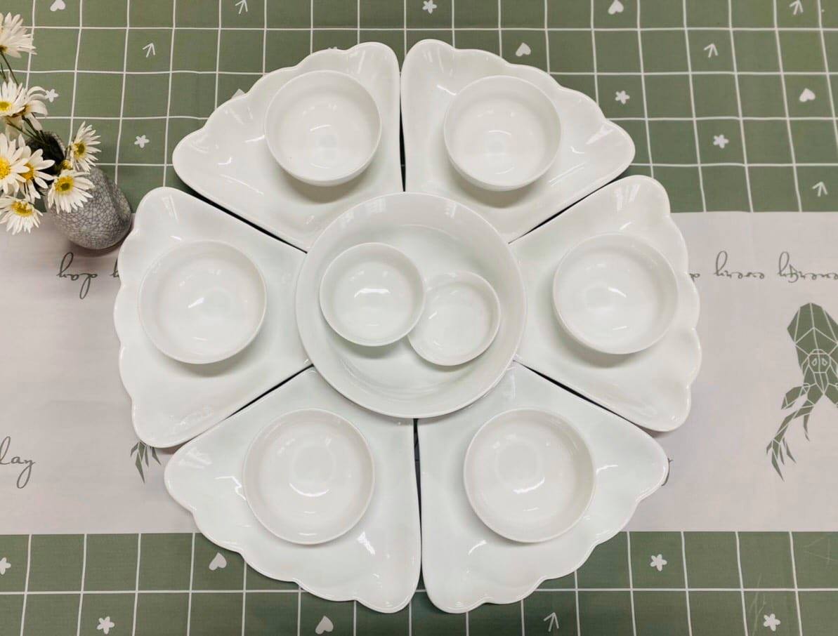 Set đĩa hoa mặt trời gốm sứ Bát Tràng cao cấp men trắng sang chảnh 1 set gồm : 1 bát tô , 6 đĩa cánh hoa , 6 bát cơm, 1 bát mắm ,